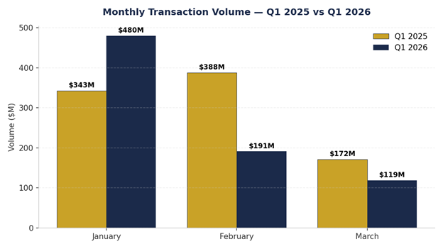 Total Volume — $790,982,800 YoY Variance — -12.4% ($902,886,734 in Q1 2025) MoM Trend — $480,362,000 (Jan) → $191,360,000 (Feb) → $119,260,800 (Mar)