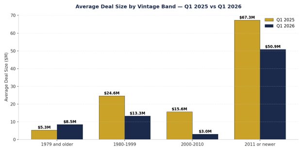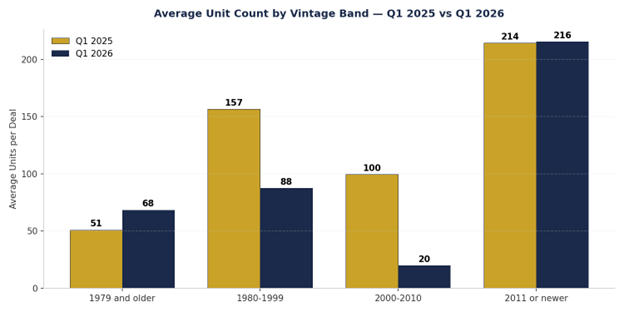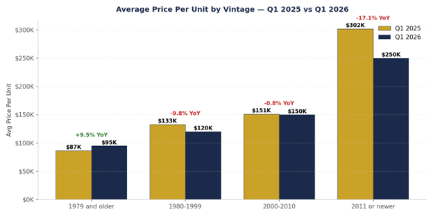 Overall: FY 2025 $160K/unit (186 deals) → Q1 2026 $149K/unit (36 deals) | -6.5% 1979 & Older: $108K → $95K | -12.0% (48 vs 11 deals) 1980–1999: $123K → $120K | -2.4% (54 vs 14 deals) 2000–2010: $154K → $150K | -2.8% (25 vs 1 deal) 2011 or Newer: $238K → $250K | +5.3% (59 vs 10 deals)