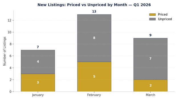New Listings — 29 total (10 priced, 19 unpriced) MoM Trend — 7 (Jan) → 13 (Feb) → 9 (Mar)