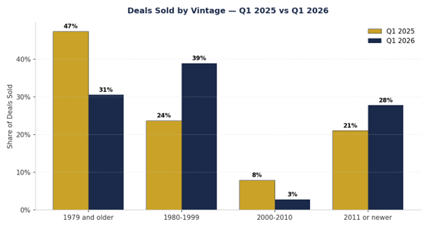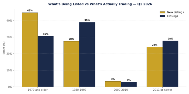 1980–1999 vintage accounted for 38.9% of Q1 closings, up from 23.7% in Q1 2025. 1979 and older dropped from 47.4% to 30.6%.