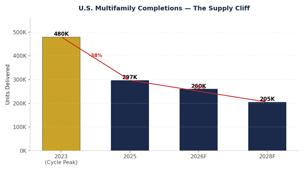 On the ground, fundamentals remain tight. Operating costs continue to pressure returns, and higher supply markets continue to feel rent and concession pressure. Supply, however, is rolling over in a meaningful way. On a national level, completions are expected to fall from ~480,000 units in 2023 to ~260,000 by 2026, with starts down more than 30% year over year.