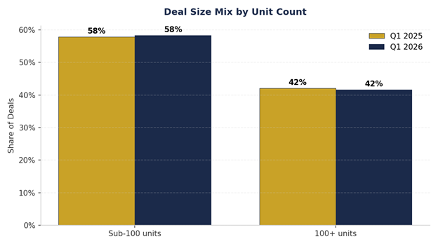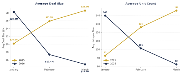 Average unit count per deal fell 41.4% from January to March 2026 (140 to 82)