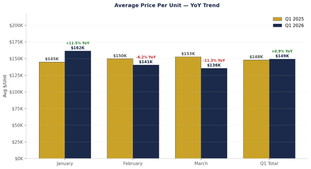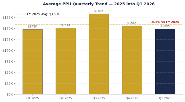 Average PPU — $149,388 YoY Variance — +0.9% ($148,105 in Q1 2025) MoM Trend — $161,595 (Jan) → $140,580 (Feb) → $135,559 (Mar)