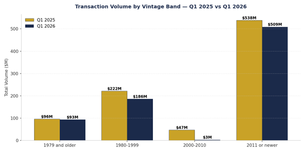 Against the full year 2025 average of $160K/unit, Q1 2026 came in at $149K/unit which was a 6.5% decline in value. Broken out by vintage: 1979 and older dropped 12.0% ($108K to $95K), 1980–1999 dipped 2.4% ($123K to $120K), and 2000–2010 slid 2.8% ($154K to $150K). The one bright spot: 2011+ product rose 5.3% to $250K/unit, the only vintage range trading above its 2025 average. (For the Q1 2025 vs. Q1 2026 pricing breakdown, see “The Data” section below.)
