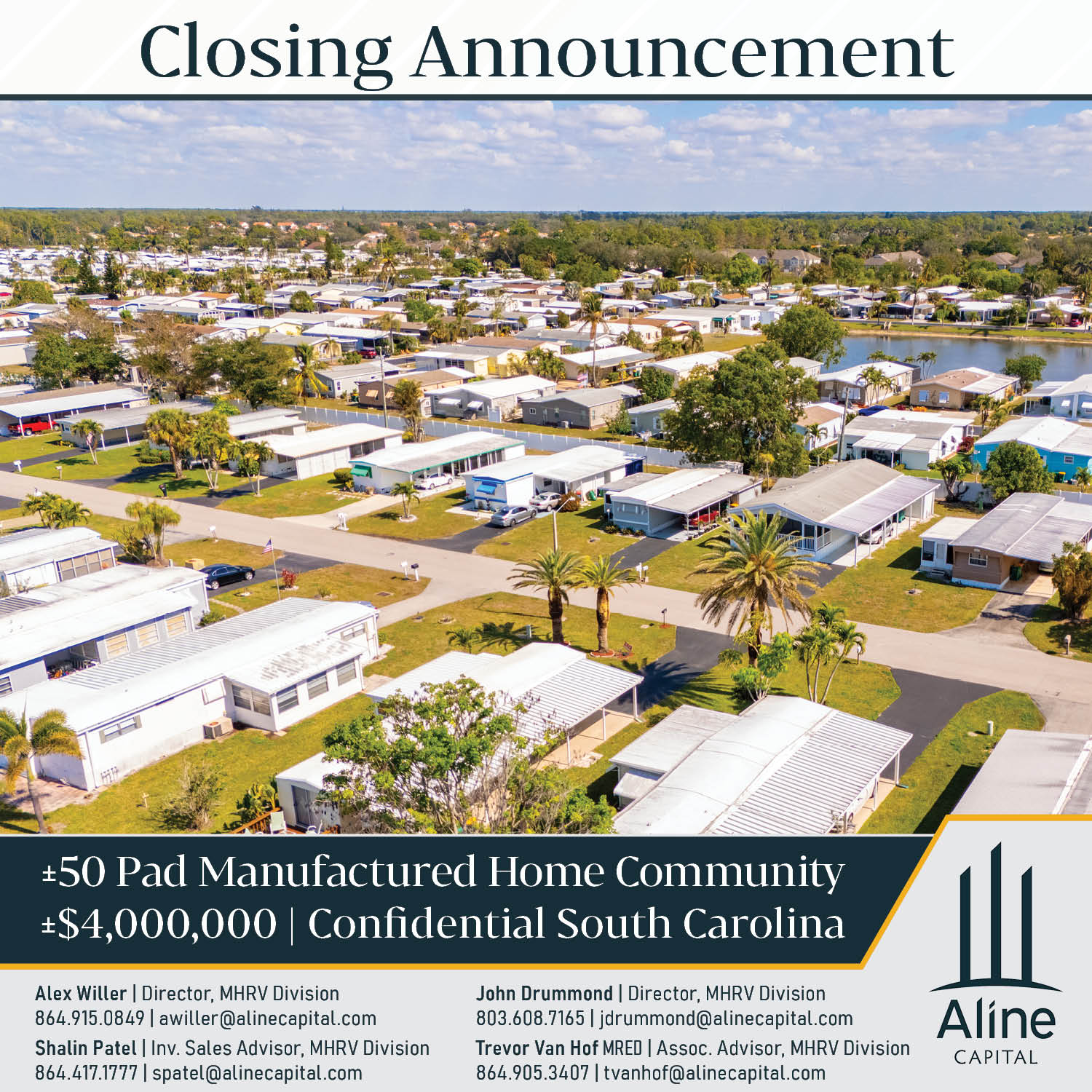Exciting news from Aline Capital! Our MHRV Advisory Division has closed a confidential manufactured housing community! Positioned near top travel spots, these properties offer residents premium amenities. Kudos to John Drummond, Alex Willer, and our team for their dedication in getting this deal closed!