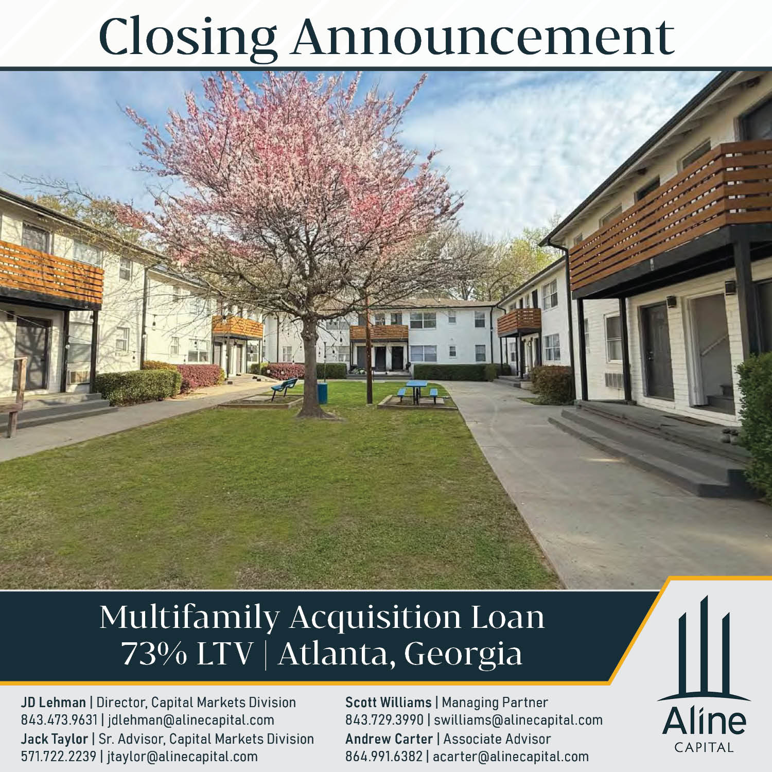 Aline Capital is pleased to announce the closing of an acquisition loan for a 112-unit multifamily property in Atlanta, GA. Aline was able to work with their client through a competitive sales process to win the deal and secure a 7-year, non-recourse Agency loan funding 73% of the purchase price. Coupled with the high LTV, Aline was able to source 2 years of interest-only payments at a mid-5% interest rate, leading to strong cash flow Day 1. We have not seen leverage over 70% in a while! Congrats to our client on a great acquisition and thank you to everyone who contributed to a successful execution!