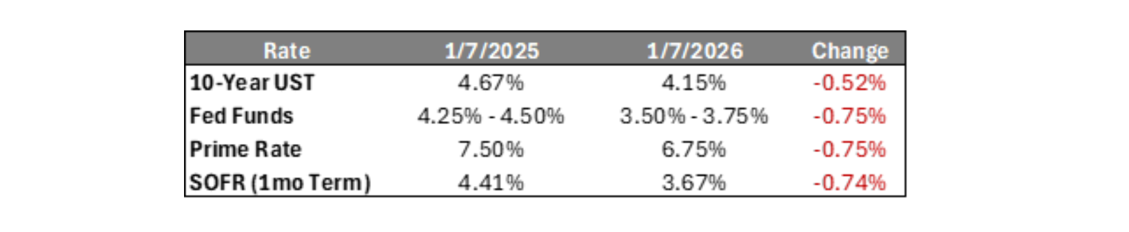 Over the course of the year, the Federal Reserve delivered three 25-basis-point cuts to the Fed Funds rate. These moves provided meaningful relief to short-term fixed and floating rates, while also contributing to improved long-term fixed-rate pricing.